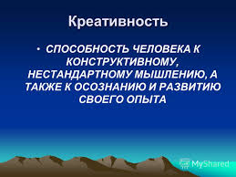 «Иногда этот ресурс действительно заблокирован, – объясняет Марина Хазанова. – Скажем, если в семье или в школе ребенка убедили, что он ни на что не способен, он, скорее всего, и став взрослым, будет убежден именно в этом». «Быть креативным – значит уметь представить себе нечто новое, отличное от того, что есть, – считает руководитель Института прикладной креативности (Германия) Петер Вайль (Peter Weil). – Каменщик, который умеет строить крепкую стену, взяв меньше кирпичей, креативен. Как и домохозяйка, которая в крохотной кухне так умно расположила вещи, что поместилось все».